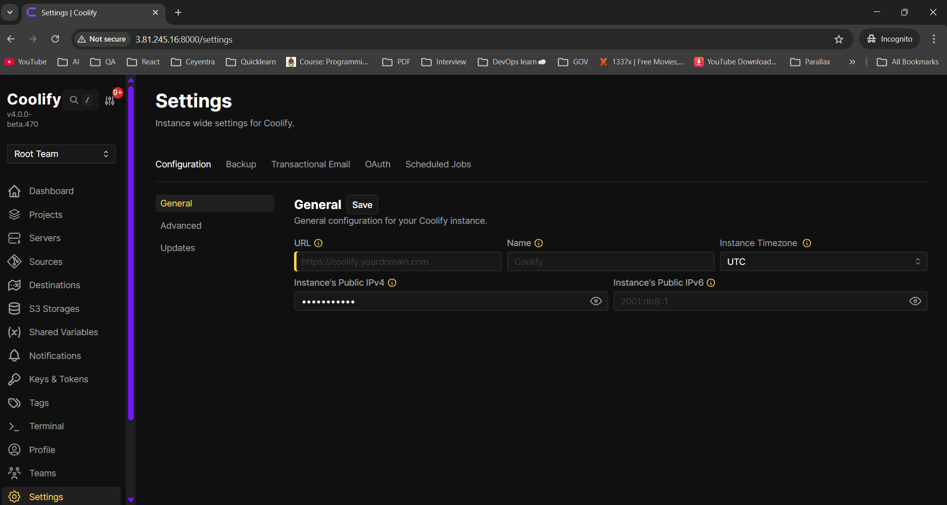 You can access the Coolify application through "DashboardUrlIp" provided in the "Outputs" tab.