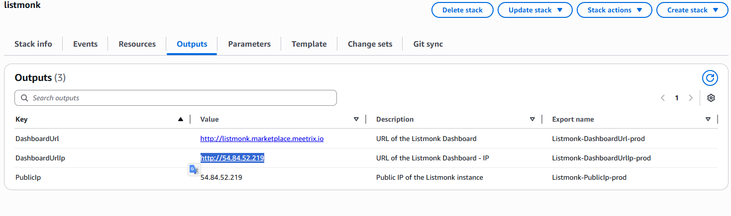 - you can access the Listmonk application through the "DashboardUrlIp" provided in the "Outputs" tab.