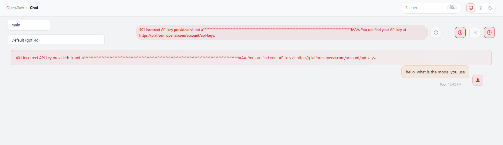 5. If you cannot use the chat and face "Incorrect API key provided" error,