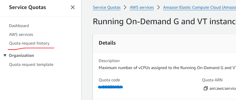 6. You can check the status of your request here. Click on the 'Quota request history'